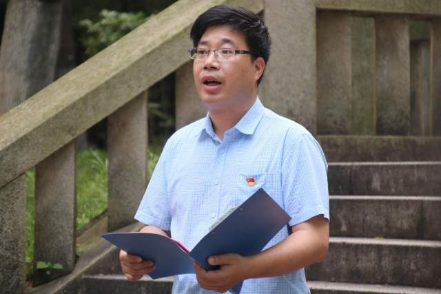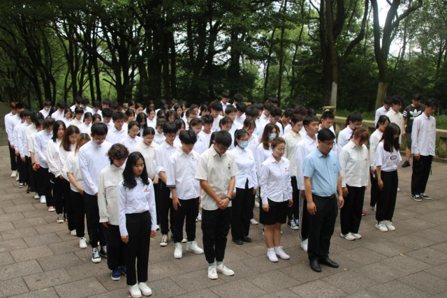 全体师生在纪念碑长梯下肃立,敬献花圈,向先辈致敬。由学院党委副书记邱晓平整理花圈绸带,全体师生向烈士行鞠躬礼并默哀一分钟,向烈士致敬。大骨一班学员解斯程代表全体大骨班成员发言,表示将在爱国主义教育中学习党史,感悟烈士精神。大骨七班学员周浩京带领全体大骨班学员重温入团誓词,体悟誓词中磅礴的青春力量。