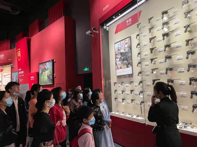 军事装备展示中心外形为一面迎风招展、鲜艳夺目的军旗。这面军旗巧妙的围成整座展示中心的外墙,游客站在任何角度看,都能看到一面军旗的模样,随风飘舞的军旗如波浪般起伏翻卷,让人联想起风起云涌的革命英雄画卷和波澜壮阔的中国共产党历史,教师们被这面军旗所震撼,大家表示,江西是一片充满红色记忆的红土地,党史上的许多重大事件曾经在这里发生,共产党人的文韬武略大都在这里试验过、预演过。要牢记2019年习近平总书记在江西考察的讲话精神:“要饮水思源,不要忘了革命先烈,不要忘了党的初心和使命,不要忘了我们的革命理想、革命宗旨,不要忘了我们中央苏区、革命老区的父老乡亲们。”