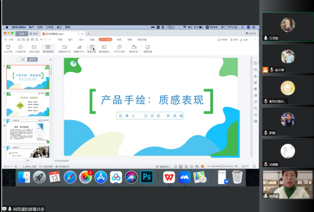 第三位是产品设计教研室彭美娥老师就《产品手绘:质感表现》课程中的“手绘质感表现”进行了说课分享,对课程知识目标、技能目标、思政目标、素养目标的达成有了较为详尽的分析,强调在教学手法上的一系列创新设计,层层递进,展示了丰富的教学成果,形成了较为完整的说课流程。