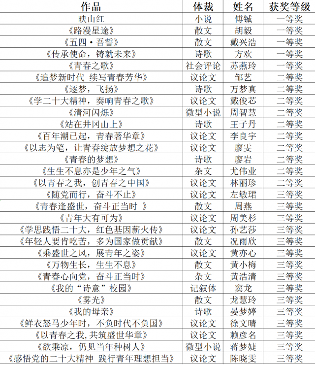 由江西省写作学会主办的江西省第十八届大学生写作大赛于8月21日落下帷幕,经过学院初选,大赛评委会最终评审,我院共30件作品获得奖项,其中大赛一等奖5篇,大赛二等奖10篇,大赛三等奖15篇,我院作品初赛由艺术与传播系承办,此次大赛艺术与传播系冷淑敏、李媛艳、田秀娟、徐彩云、陈滴滴、程昌发被评为优秀指导老师。此次大赛主题为学习党的二十大精神,感悟美好生活,书写青春芳华。