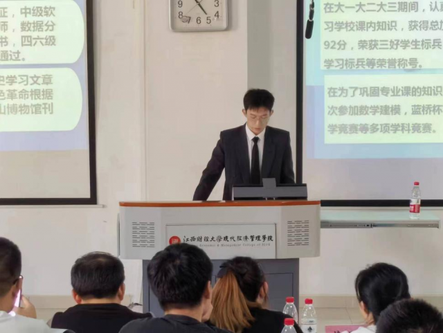 经过系部材料初审公示确定6名优秀的候选人参与此次风采展,按照会前抽签顺序,依次进行汇报展示。在展示过程中,候选人结合专业学习、社会实践、工作和生活经历,分别从思想政治、学习成绩、学科竞赛、工作任职、创新发展、志愿服务、社会实践等多个方面进行自我展示汇报。