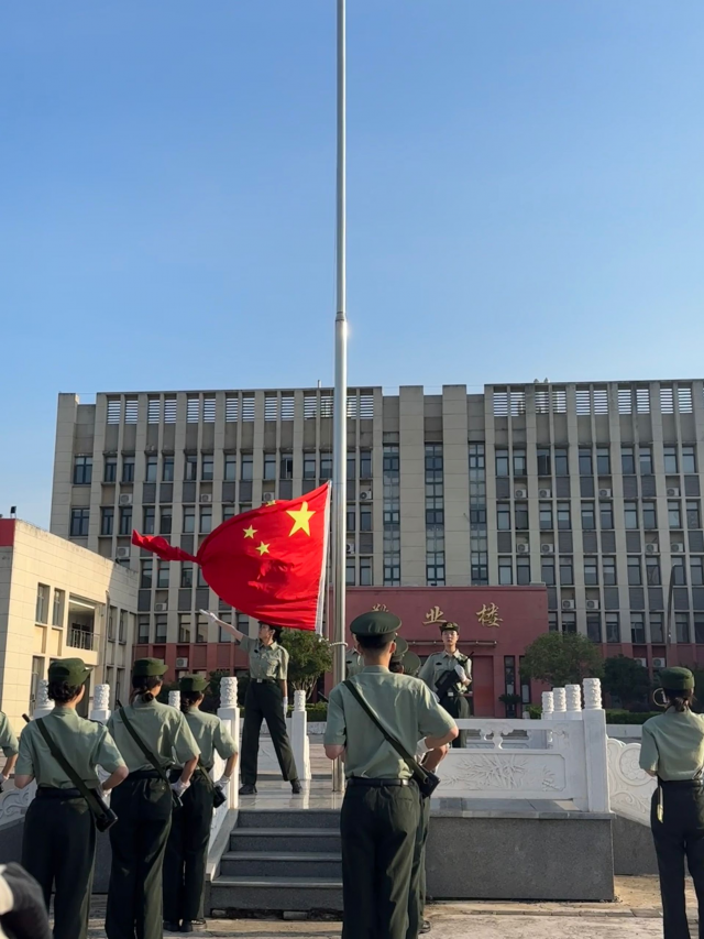 当清晨的第一缕阳光洒向大地时,国旗护卫队迈着整齐的步伐,昂首阔步,将五星红旗冉冉升起。同学们表情严肃,坚定的目光追随着飘扬的五星红旗。