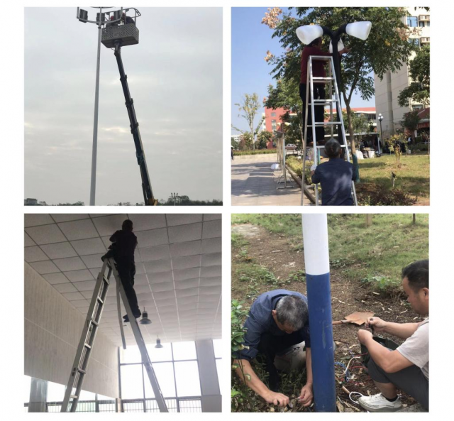 我院校园庭院灯及室内场馆天棚灯自2016年投入使用到目前,由于使用年限过久,多数路灯灯杆老化生锈,部分灯罩损坏,灯光光源衰减无光泽,加之道路两侧树木遮挡,大大影响了照明效果,给师生学习生活及夜间出行造成一定的安全隐患。在分管院领导的要求下,后勤保障部水电中心对共青校区校园灯光问题开展了细致深入地摸排后对路灯进行全面检测维修,更换了尚信、求知、求真楼等周边庭院灯头、灯泡50余组,更换了体育部国术馆、乒乓球室、健美操室、健身房等场所天棚灯30余套。通过更换光源、擦拭灯罩、清除蛛网、扶正灯杆等措施,美化、亮化了我院校园环境,方便师生夜间出行,消除了安全隐患。