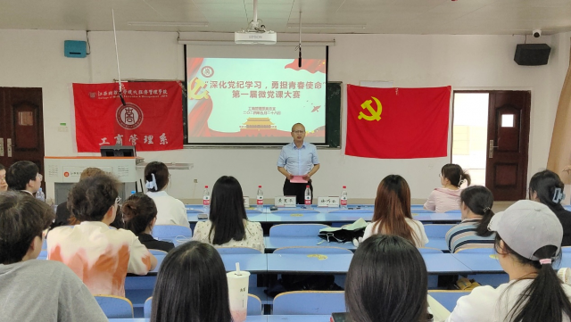为切实提升学生党员理论素养和政治自觉,引导广大党员用青年视角、青年语言讲好奋进故事,引导广大党员感悟思想伟力,始终保持统一的思想、坚定的意志以及增强大学生的使命感、责任感和荣誉感。5月28日下午,工商管理系“深化党纪学习教育,勇担青春使命”第一届微党课大赛在求知楼1302正式开幕。学院党委书记黄黑平,工商管理系党总支副书记李骞,工商管理系学生第一党支部书记徐巧云,工商管理系辅导员钟思琪担任评委老师。工商管理系2021级全体党员参加大赛。