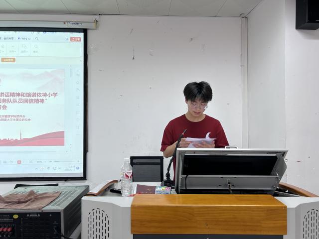 本次会议共分为四个议程。第一项议程为院主席团成员伏雨晴作为青年团学干部代表领学。她带领参会人员逐字逐句研读习近平总书记重要讲话精神,深入剖析其核心要义,着重解读习近平总书记给谢依特小学戍边支教西部计划志愿者服务队队员回信中对青年的殷切期望,为后续研讨奠定坚实理论基础。