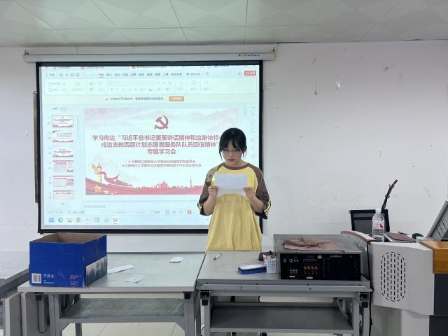 第二项议程由宣讲团成员代表何瑶燕进行讲解。她结合实际案例与亲身感悟,生动阐释理论内涵,将习近平总书记对西部建设、青年担当的理念以通俗易懂的方式传递,让大家更直观理解时代赋予青年的使命与责任。