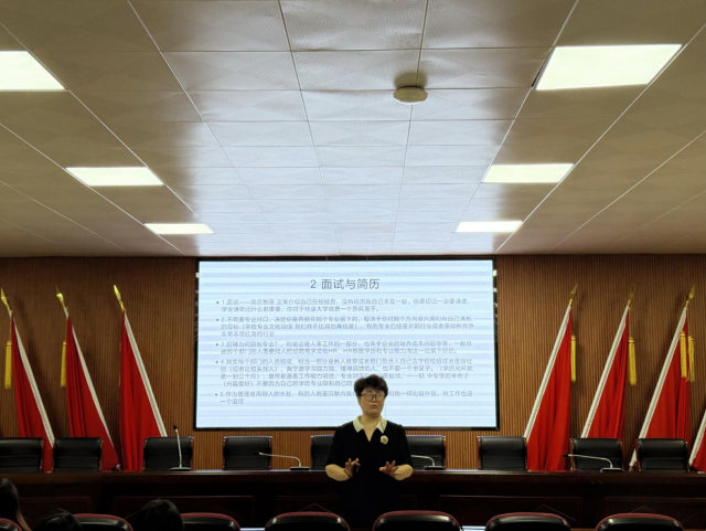 讲座接近尾声,孙瑛进行总结。她对优秀校友的到来表示感谢,并强调了校友资源的重要性,同时她建议同学们要保持自信,注重职场沟通,抓住暑期实习机会,提升就业竞争力,鼓励学生将职业兴趣转化为奋斗动力,在热爱的领域深耕细作。最后,她向在场的学生发出倡议,希望大家积极参与职业规划、就业指导等服务活动,主动把握职业发展资源,为未来就业做好充分准备。