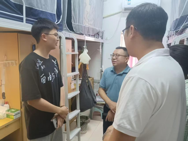 随后,毛小兵深入走访学生宿舍,与同学们亲切交谈,仔细询问生活起居和日常习惯,全面了解宿舍生活情况。交流中,他鼓励同学们加强体育锻炼,保持规律作息,通过运动增强体质、释放压力。同时,他还特别强调良好生活习惯对身心健康和学习状态的重要性,希望同学们利用课余时间积极参与体育活动,以更饱满的精神面貌投入学习生活。