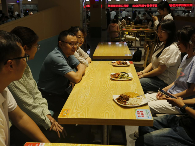最后,毛小兵在袁园、王新平、胡骁等陪同下,来到五味斋食堂一楼,与同学们一同就餐。就餐前,一行人对食堂卫生条件、环境设施进行全面巡查。用餐时,毛小兵与同学们围坐畅谈,关切询问饭菜口味、分量及价格等情况,现场氛围温馨融洽。他强调,食堂作为学生健康成长的重要保障,肩负着科学配餐、营养供给的重任,学校将持续强化食堂管理,严把食品安全关,全力打造安全、健康、优质的餐饮环境。