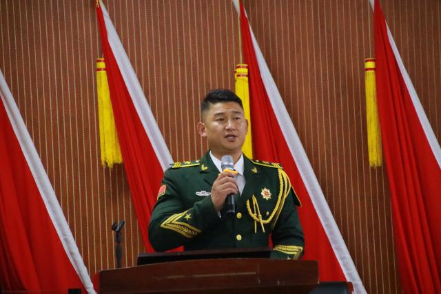 讲座中,马松涛同志以亲身经历为切入点,用质朴的语言和生动的细节,讲述天安门国旗护卫队队员在日复一日的训练与任务中锤炼出的坚定信仰。他提到,每一次出旗、升旗、护旗的背后,是队员们对“零误差”标准的极致追求,更是对祖国无限忠诚与担当的体现。“国旗高于生命,责任重于泰山”不仅是口号,更是镌刻在每一名国旗护卫队战士心中的行动准则。马松涛同志通过真实的故事和感人的细节,向在场师生展现了国旗护卫队战士的崇高精神风貌。他特别强调,护卫国旗不仅是一份荣耀,更是一份沉甸甸的责任,需要以绝对的纪律性、高度的使命感和无私的奉献精神去践行。他的讲述深深打动了在场师生,现场多次响起热烈掌声。