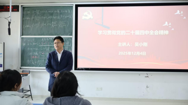 吴小刚首先就学习贯彻党的二十届四中全会精神与同学们交流分享。他结合国家发展大局与高等教育使命,鼓励同学们作为新时代大学生和未来市场领域人才,应主动将个人成长融入国家发展,提升政治素养,坚定理想信念,勇担时代责任。
