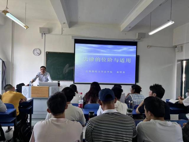 在讲授过程中,袁明圣教授首先向学生说明了法理学课程对于法学专业同学学习法学学科的重要性,他详细阐述我国法律渊源和其法律位阶,就法律位阶冲突规则进行讨论,现场气氛热烈,不时就会有学生提出自己的疑问和困惑,袁教授也耐心细致地回答了学生的提问,他寄期望于法学学子,发展是人类文明进步的基本方式和不竭动力。从“依法治国”到“全面依法治国”,从“法治国家”到“法治中国”,从“形成法律体系”到“建设法治体系”,从“有法可依、有法必依、执法必严、违法必究”到“科学立法、严格执法、公正司法、全民守法”,从加强国内法治建设到“统筹推进国内法治和涉外法治”,从“为全面建成小康社会提供长期稳定的法治保障”到“在法治轨道上全面建设社会主义现代化国家”等,法治建设中每一个新概念、新论断、新理念、新举措的提出,都标志并推动着法治体系的不断丰富和持续完善。