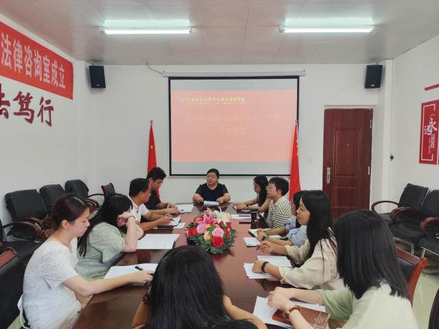 为更好开展新学期各项工作,10月9日下午,法学院召开2025-2026学年第一学期工作例会,会议围绕教学管理、学术科研、学科竞赛、新生工作等多个议题展开。法学院院长万灵娟、法学院党总支书记王锐愚及法学院全体教职员工参加会议,会议由万灵娟主持。