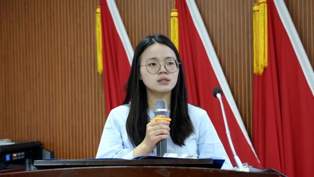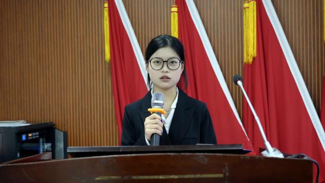 学生代表薛彩玲呼吁同学们提前进入课堂并认真听讲,自习时将手机调至静音并放入袋中,在校园内主动问好、随手捡拾垃圾,主动学习法纪知识并积极参与建设活动,共同营造良好的学院氛围。