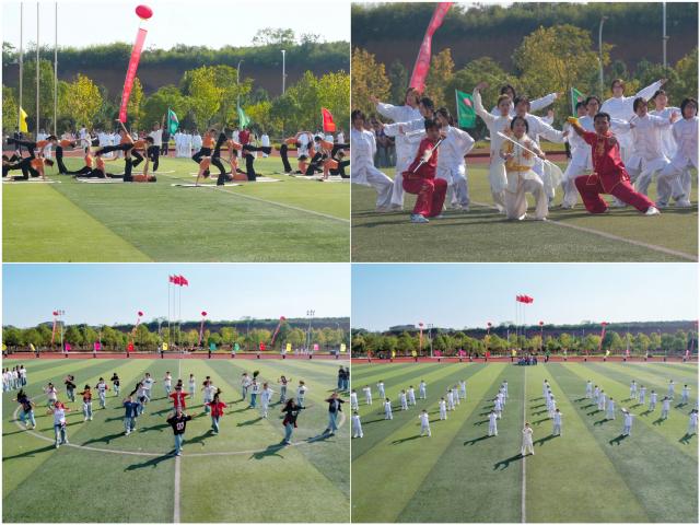 开幕式上,各表演队为师生带来了一场视听盛宴。广场舞表演由学生代表共同呈现,展现了大学生们的青春活力;健美操队带来的《Yes ok》动作整齐划一,充满力量感;舞蹈队的《rhythm triad》则以流畅的舞步和富有创意的编排赢得阵阵掌声。跆拳道表演刚劲有力,展示了学子们良好的身体素质和精神风貌;舞韵瑜伽《世界赠予我的》将柔美与力量完美结合,给人以美的享受。武术队表演的《八法五步太极拳》刚柔并济,展现了中华传统武术的博大精深;舞蹈队最后表演的《天生就要飞》将开幕式氛围推向高潮,表达了经管学子追逐梦想、勇往直前的决心。