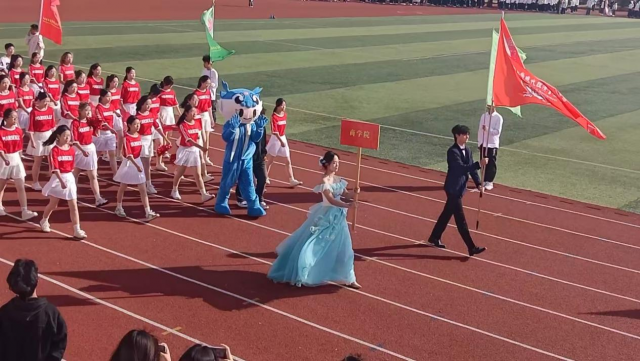 伴随着激昂的运动员进行曲,各二级学院方阵依次入场。商学院方阵凭借鲜明的学院特色与昂扬的精神风貌,成为全场关注的焦点:跑道上方无人机举着商学院旗帜迎风飘扬;方阵成员身着统一且印有商学院标识的服装,步伐整齐有力,精神抖擞地迈过主席台,并齐声喊出“商院学子,勇毅笃行;逐梦赛场,再创佳绩”的响亮口号,不仅展现出商学院学子的青春活力,更传递出学院积极进取的精神底色,赢得看台上师生们的阵阵欢呼与掌声。