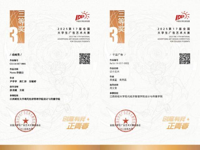 近日,第17届全国大学生广告艺术大赛(简称“大广赛”)获奖名单正式公布。在本次大赛中,设计与传播学院学子再创佳绩,共获得奖项30项,涉及短视频类、微电影类、动画类、策划类和平面类广告,其中国家级三等奖2项,省级一等奖4项、二等奖7项、三等奖17项。