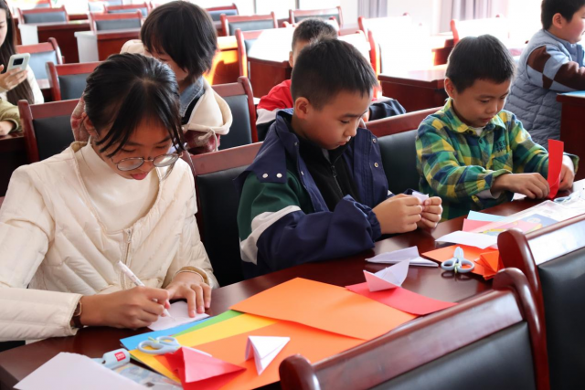 在志愿者的讲解与示范后,小朋友们学习了剪纸的基本步骤,包括折叠、画稿与裁剪,从简单几何图案到趣味卡通造型,一个完美的作品呈现在了大家面前。孩子们积极参与,认真临摹实践,指尖巧作中,彩纸凝练成精美作品,欢声笑语中,传统手工艺魅力悄然浸润童心。