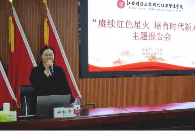 为完善党建思政工作体系、丰富“大思政课”教学形式,探索全省大中小学思政课(红色文化)一体化实践,12月18日上午,我院于敬业楼101室举办“赓续红色薪火,培育时代新人”主题报告会。学院特邀江西省最美教师、九江市修水县第一小学党总支书记、校长钟秋香作专题报告,学院党委书记黄黑平,党委副书记邱晓平出席会议,会议由党委学生工作部部长冯伟主持。